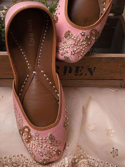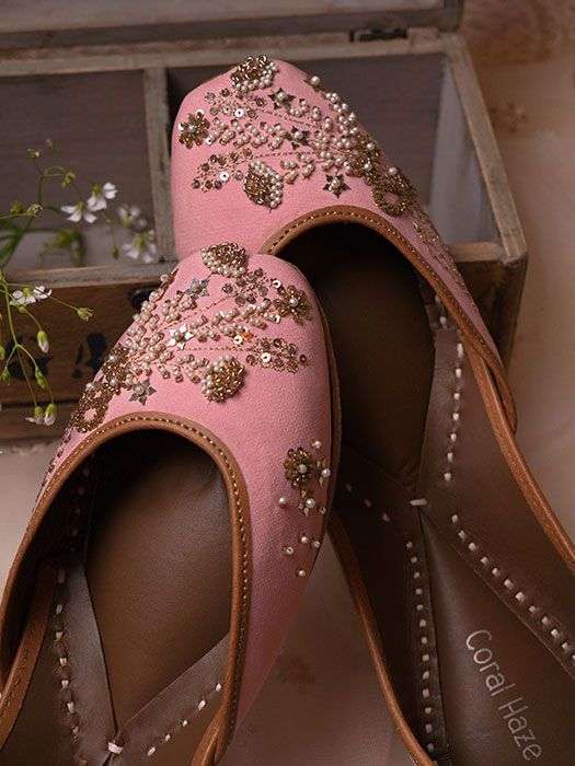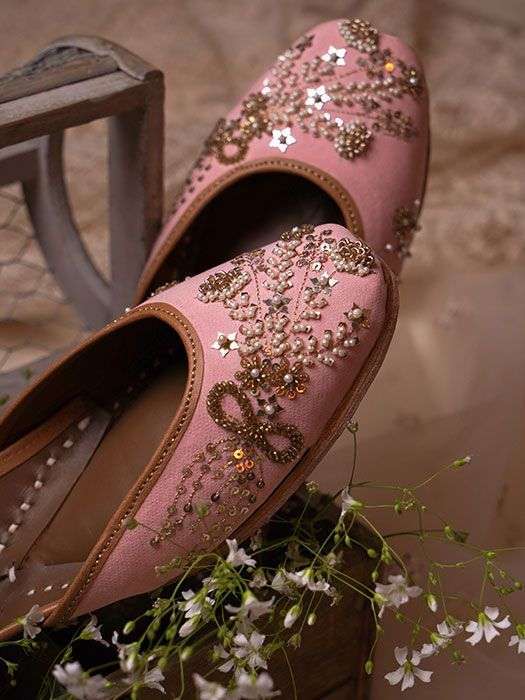 Peach juttis with hand-embroidered bouquet and bow