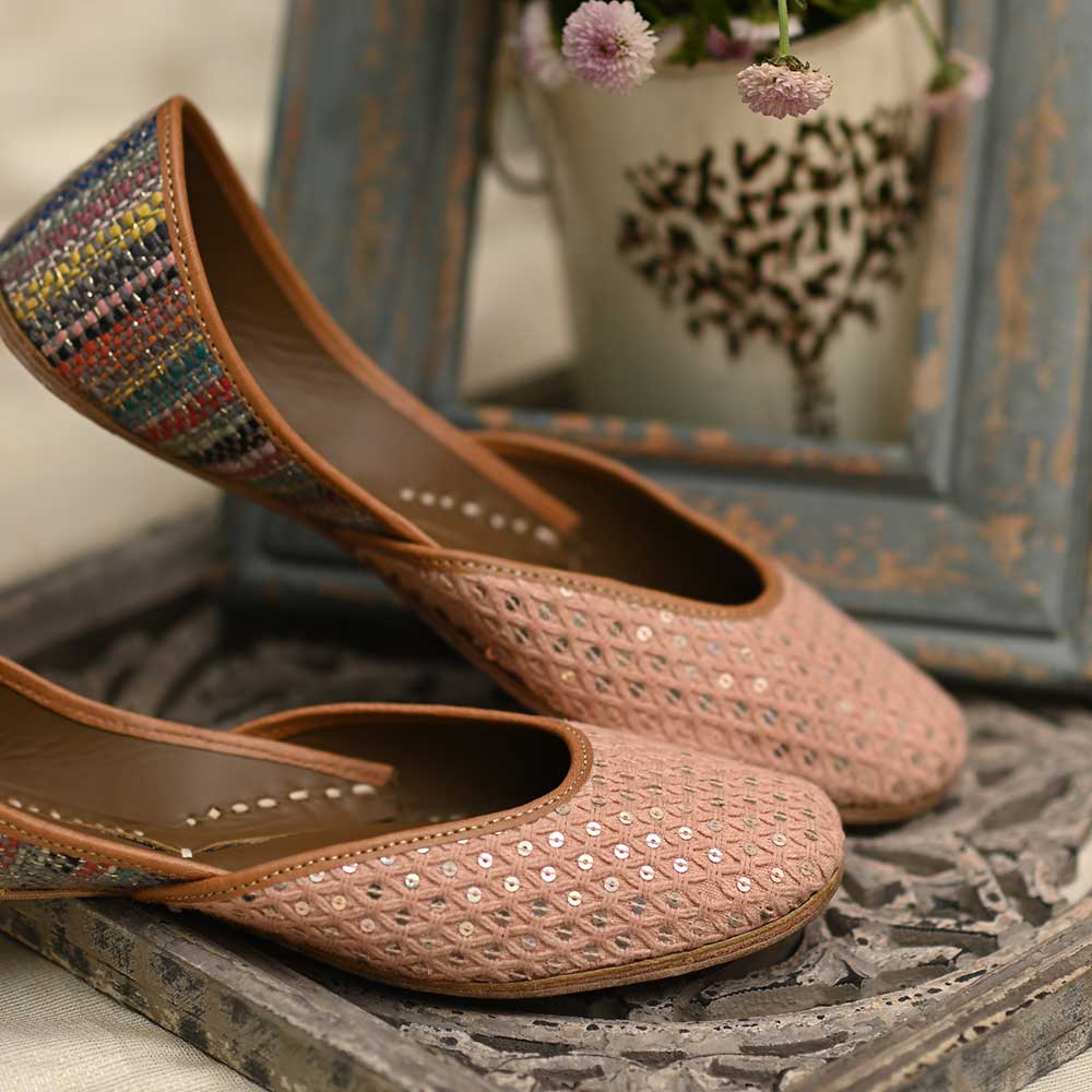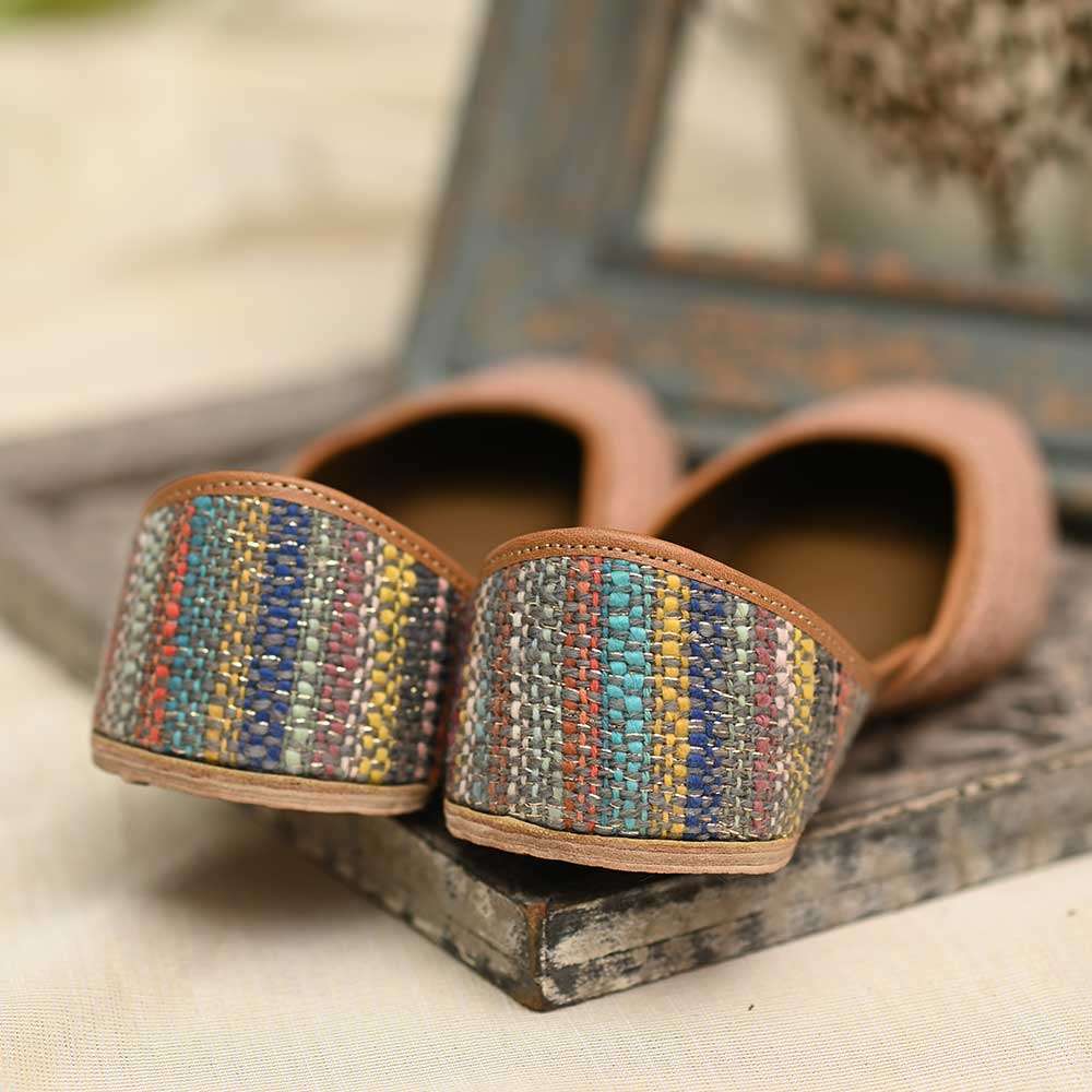 A semi-formal pair of juttis featuring, a peach jacquard front and a multi-colored back. The mishmash of a checkered upper and striped back makes this such an interesting pair to look at. Blinker gets its finished look with a subtle pop of gold using tiny sequins that have been hand-embroidered on the front of the juttis.