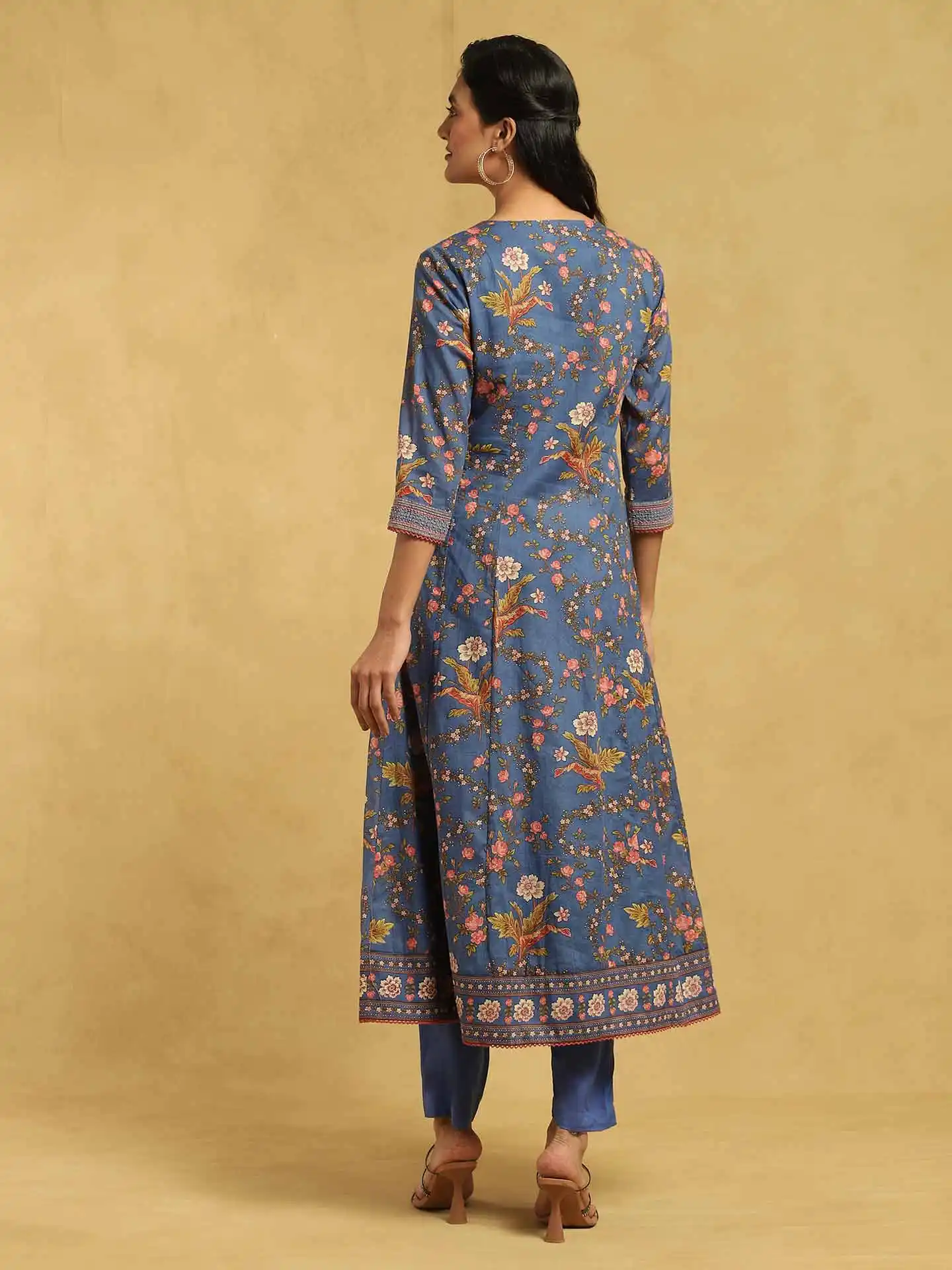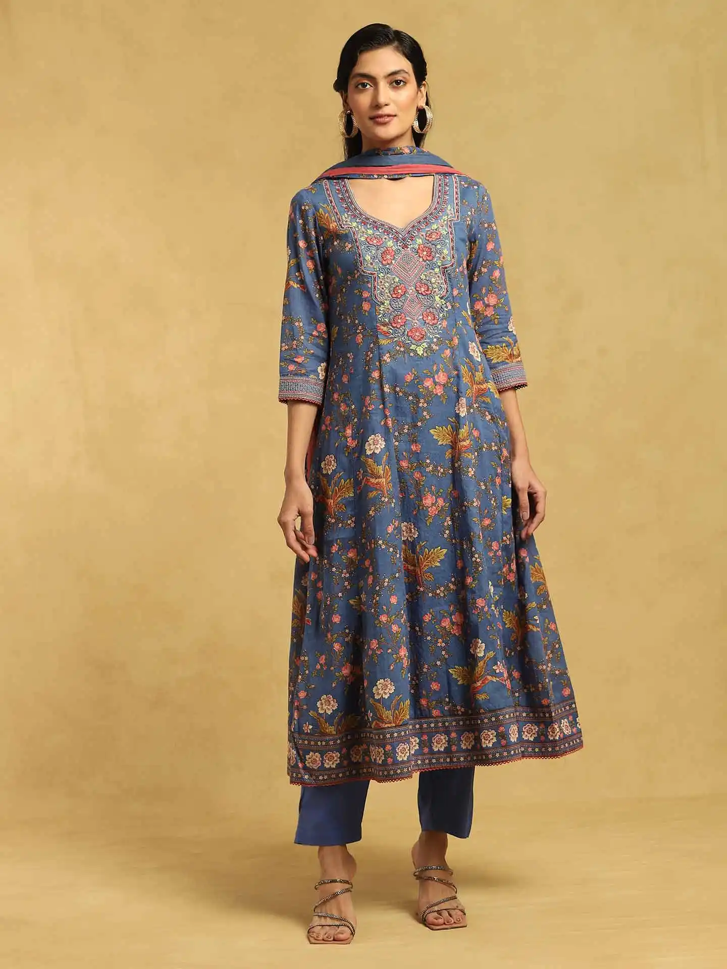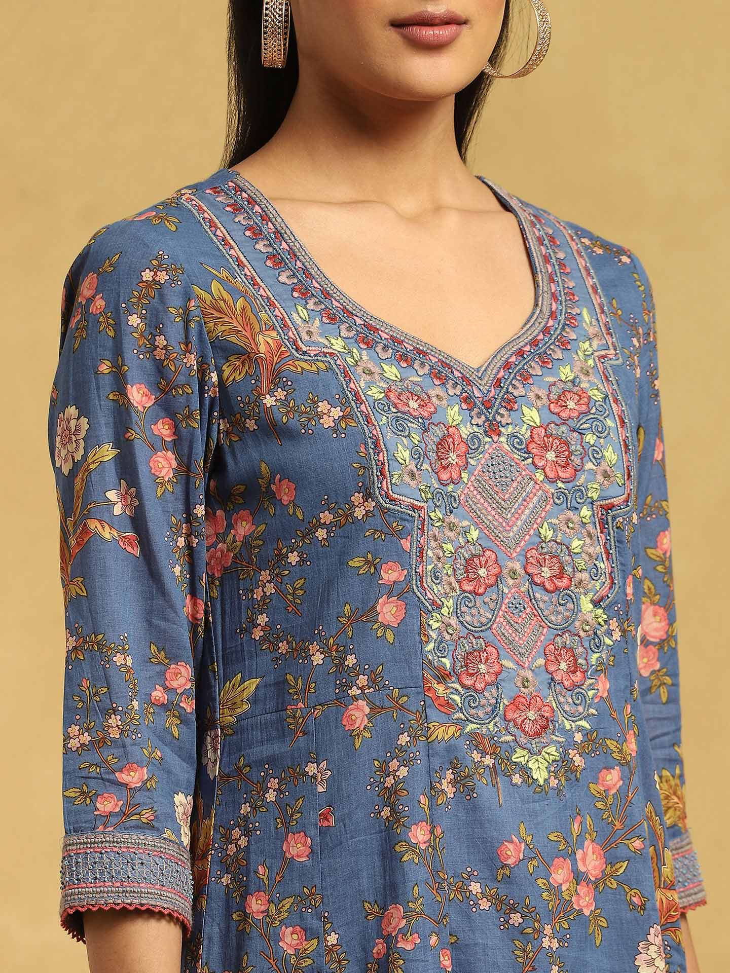Blue Botanic Print Embroidered Suit Set