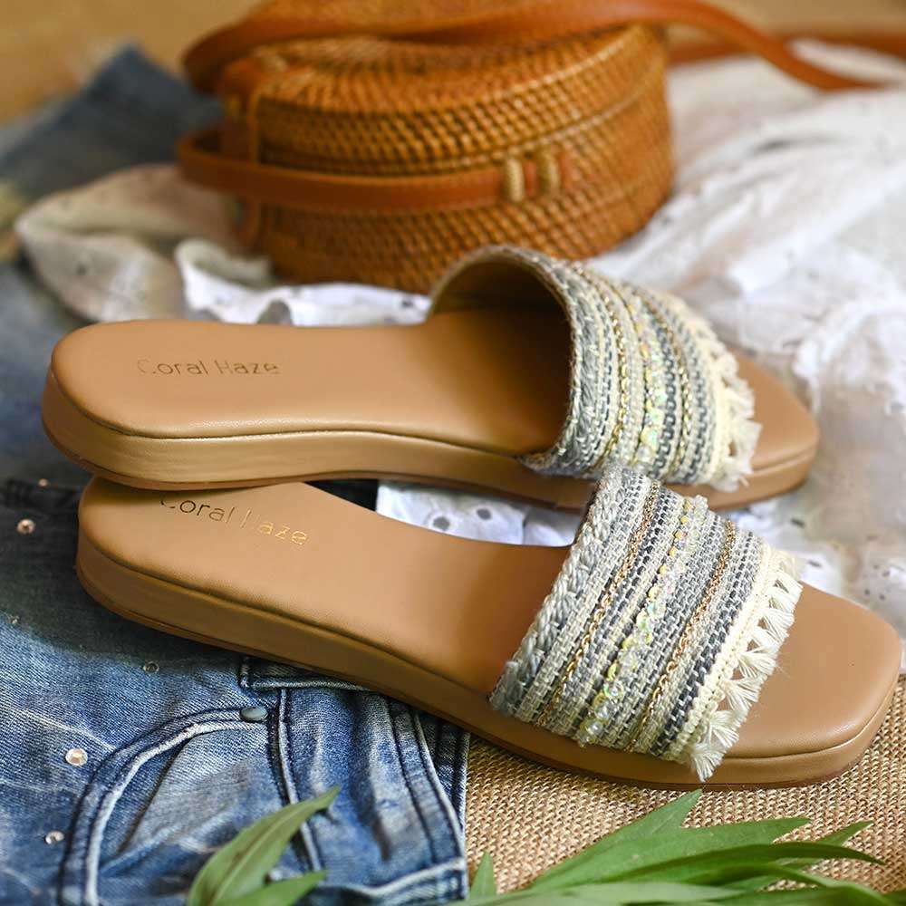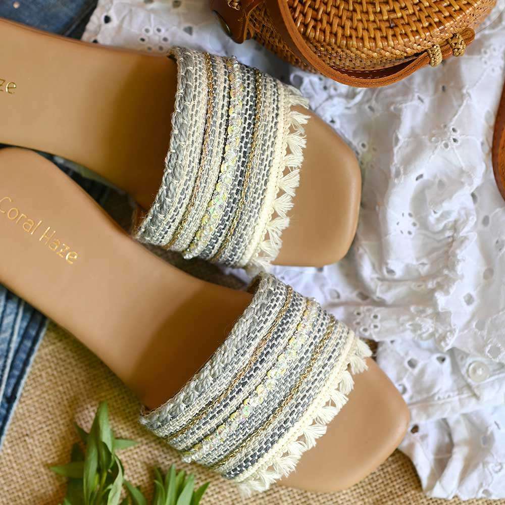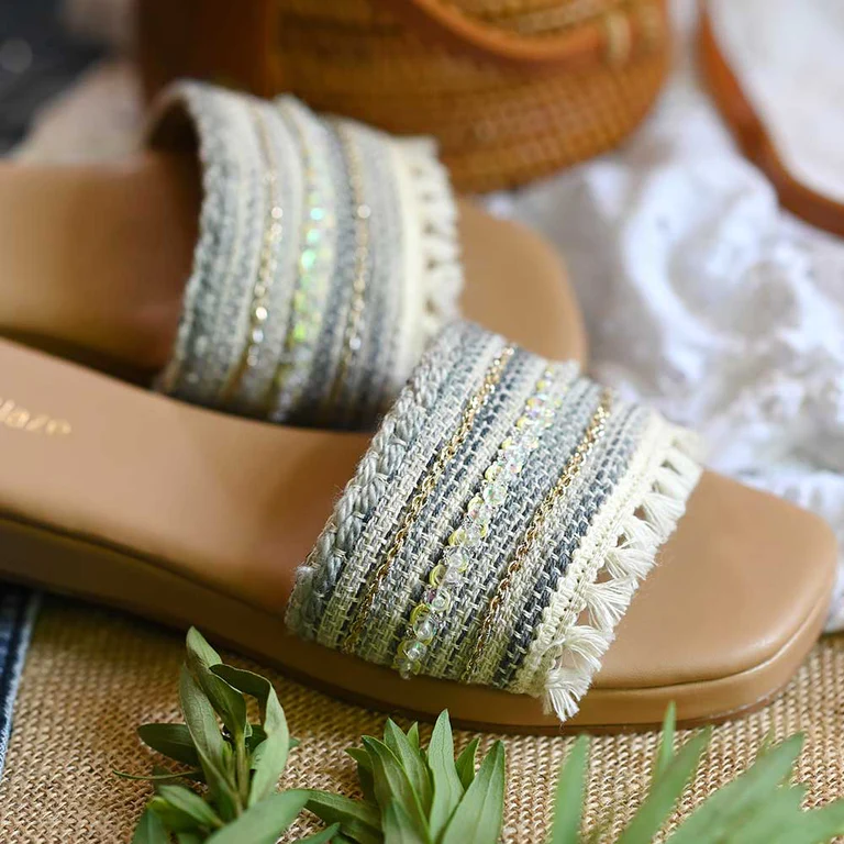 We’ve created the perfect summer slides for you! Handcrafted from the finest, Vegan Leather, Bluespace has got a comfortable, cushioned tan-colored sole. The broad denim-colored jacquard strap is, highlighted using tonal sequins, sleek gold braids, and ivory fringes.