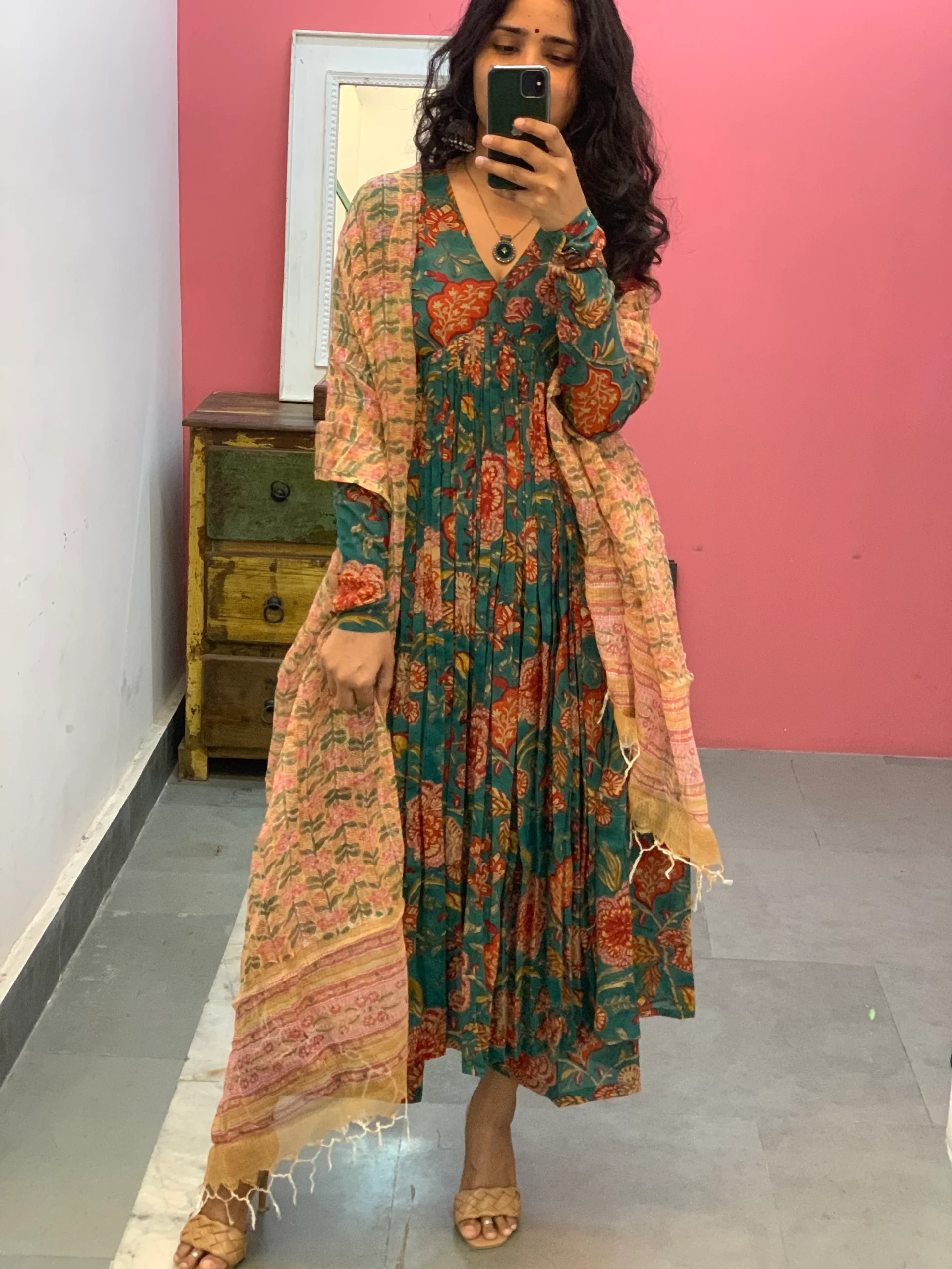 Dark green block printed Anarkali and loose pajama pants in MUL Cotton with Kota dupatta.