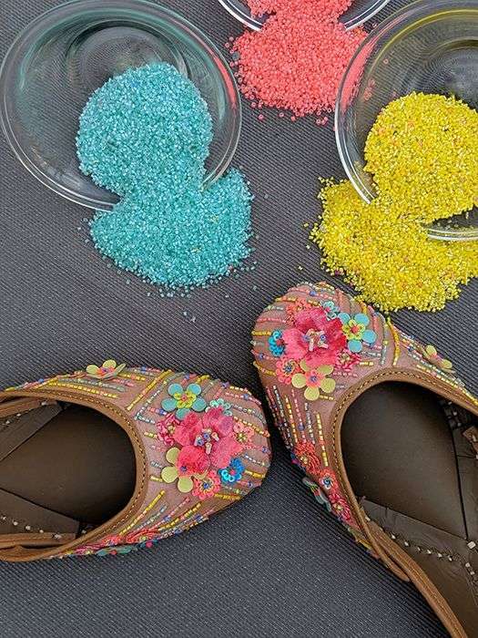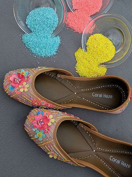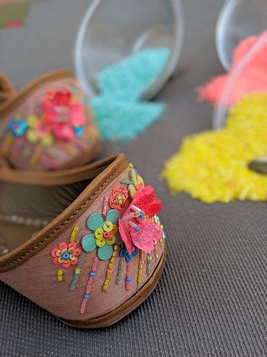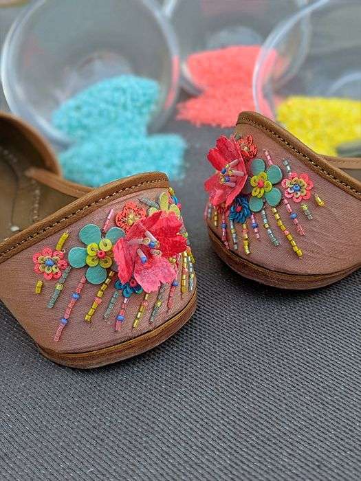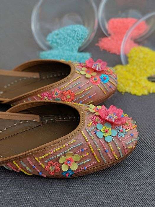 Multi-colored beadwork jutti with sequin and 3D flowers set on a light peach base