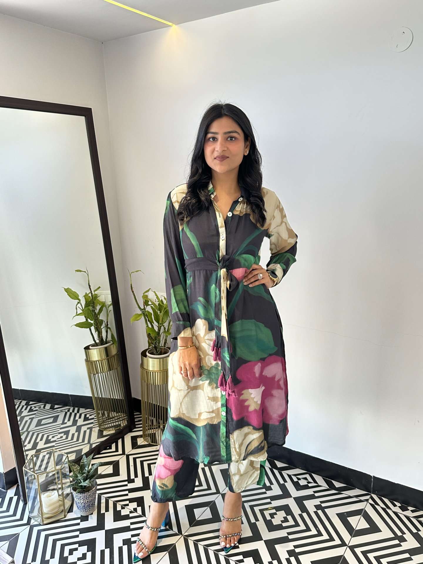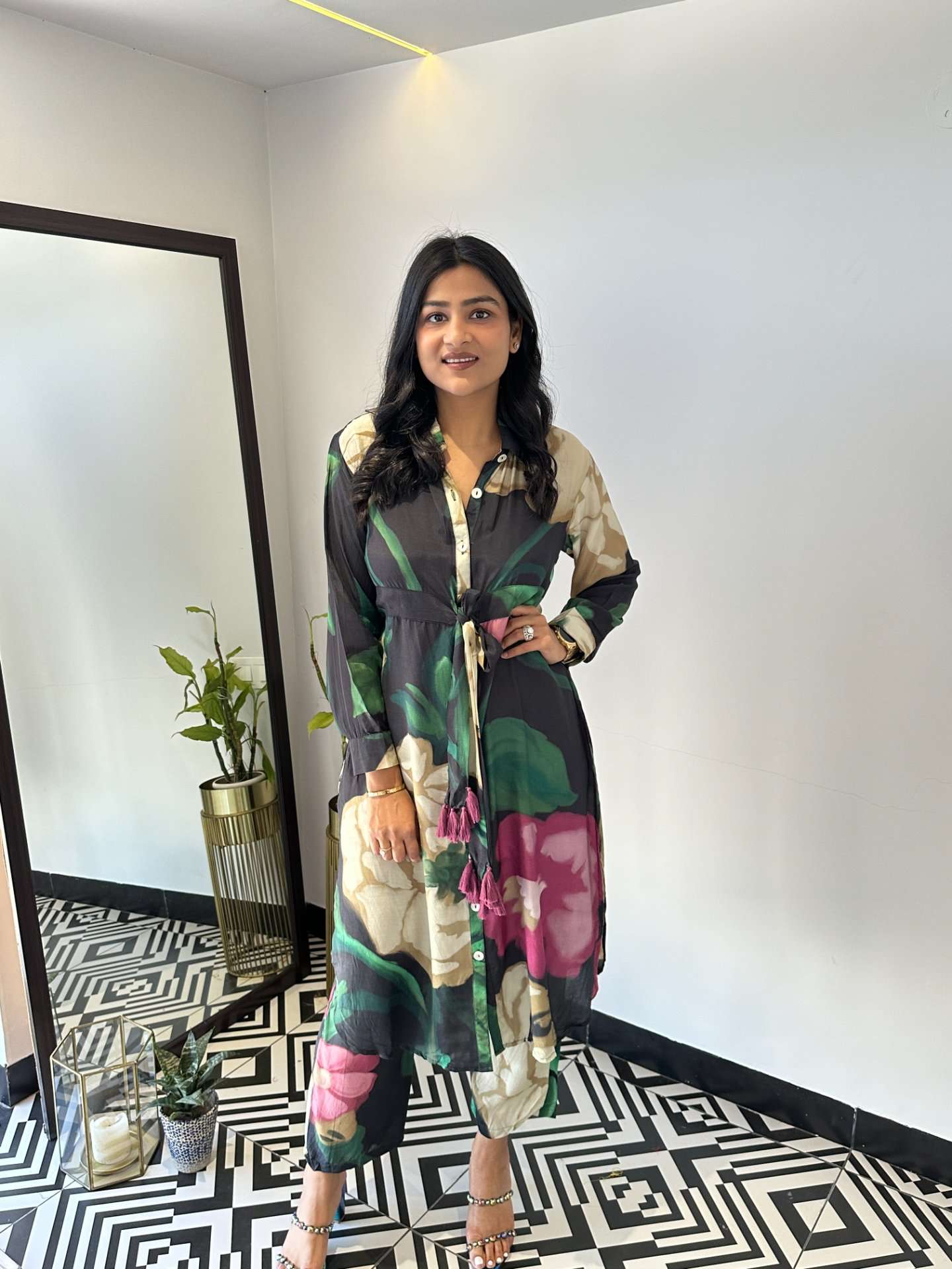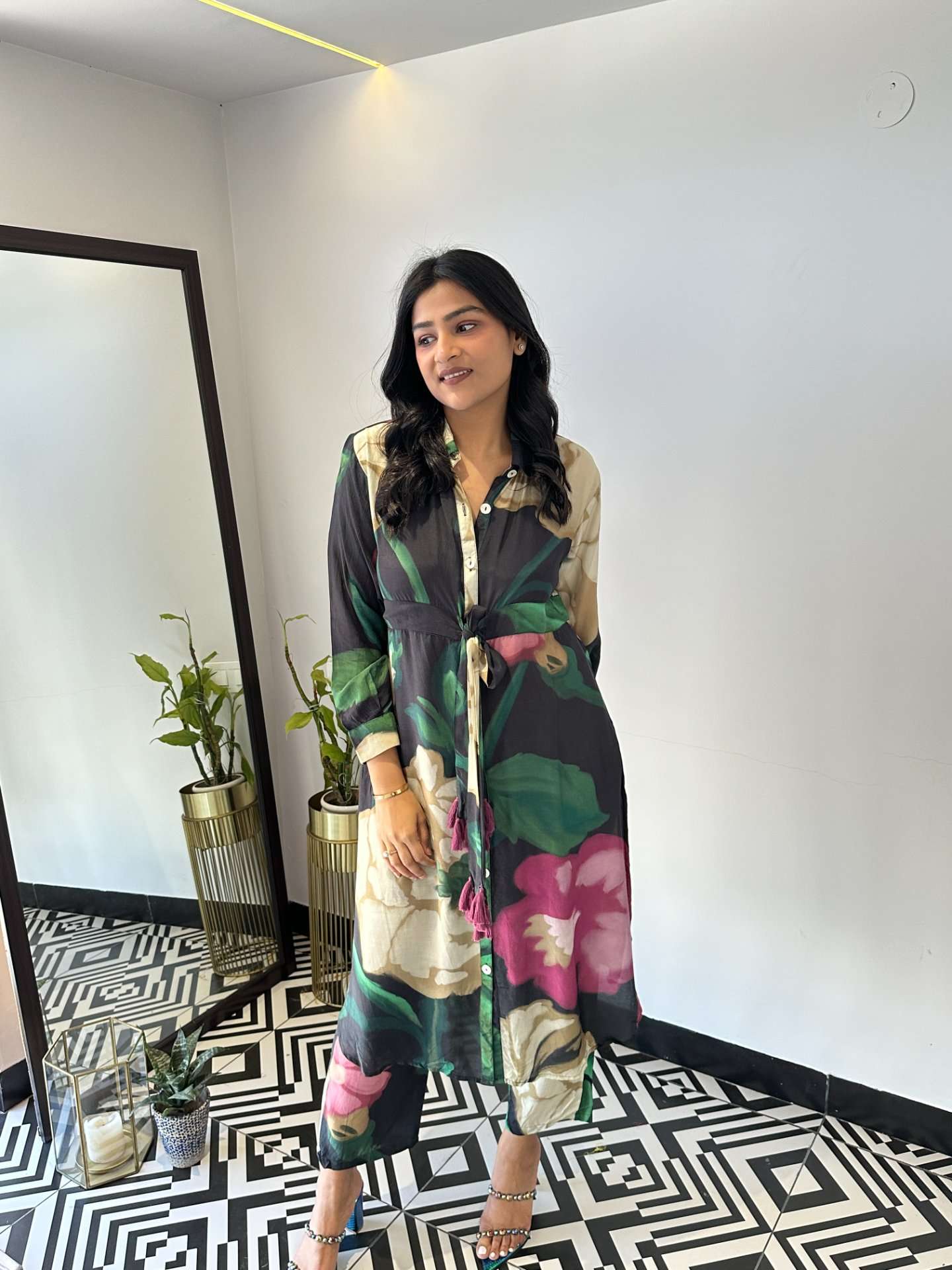 Pure Muslin Long Cord Set With Beautiful floral print and a belt to give a perfect fit.