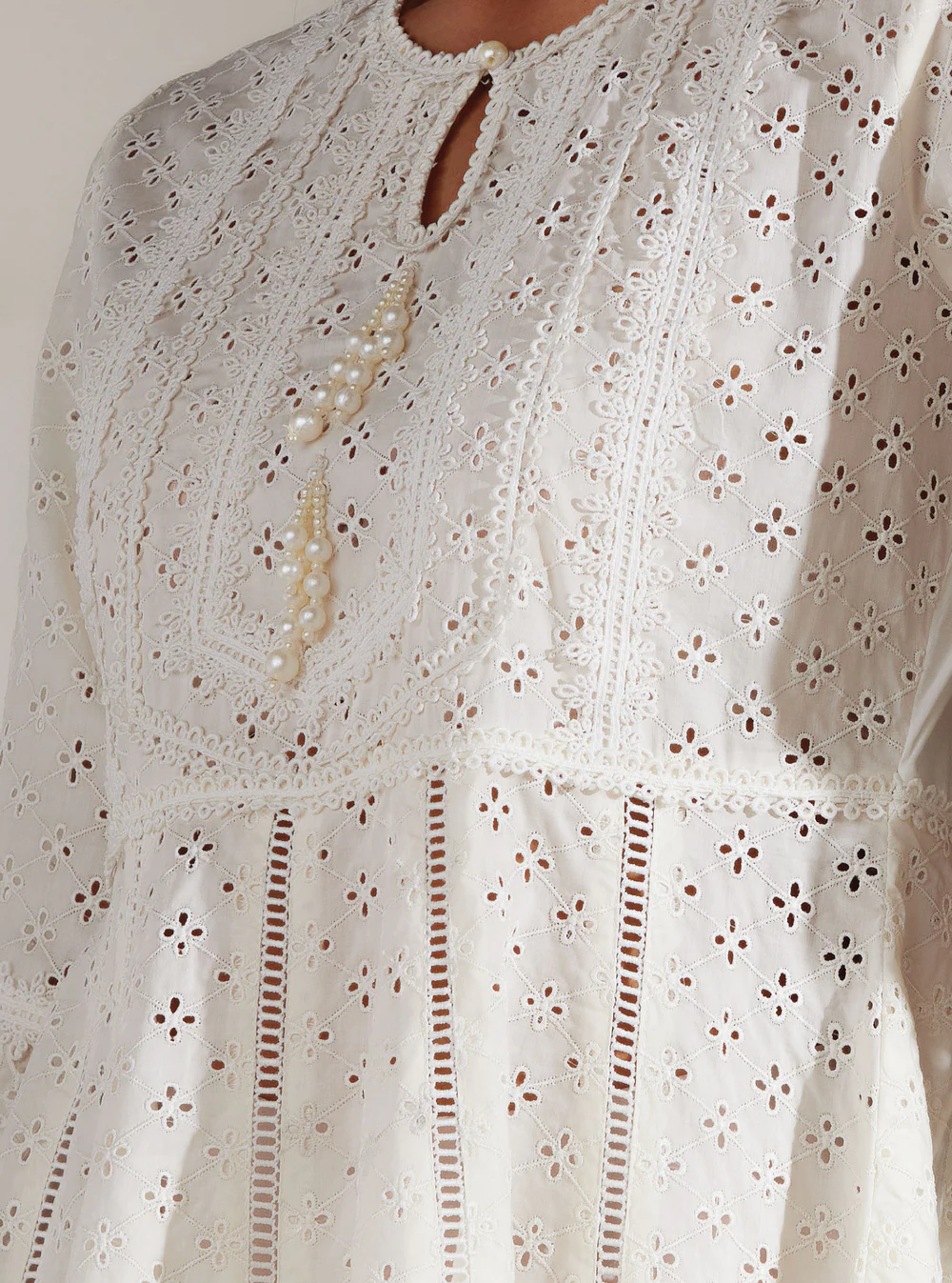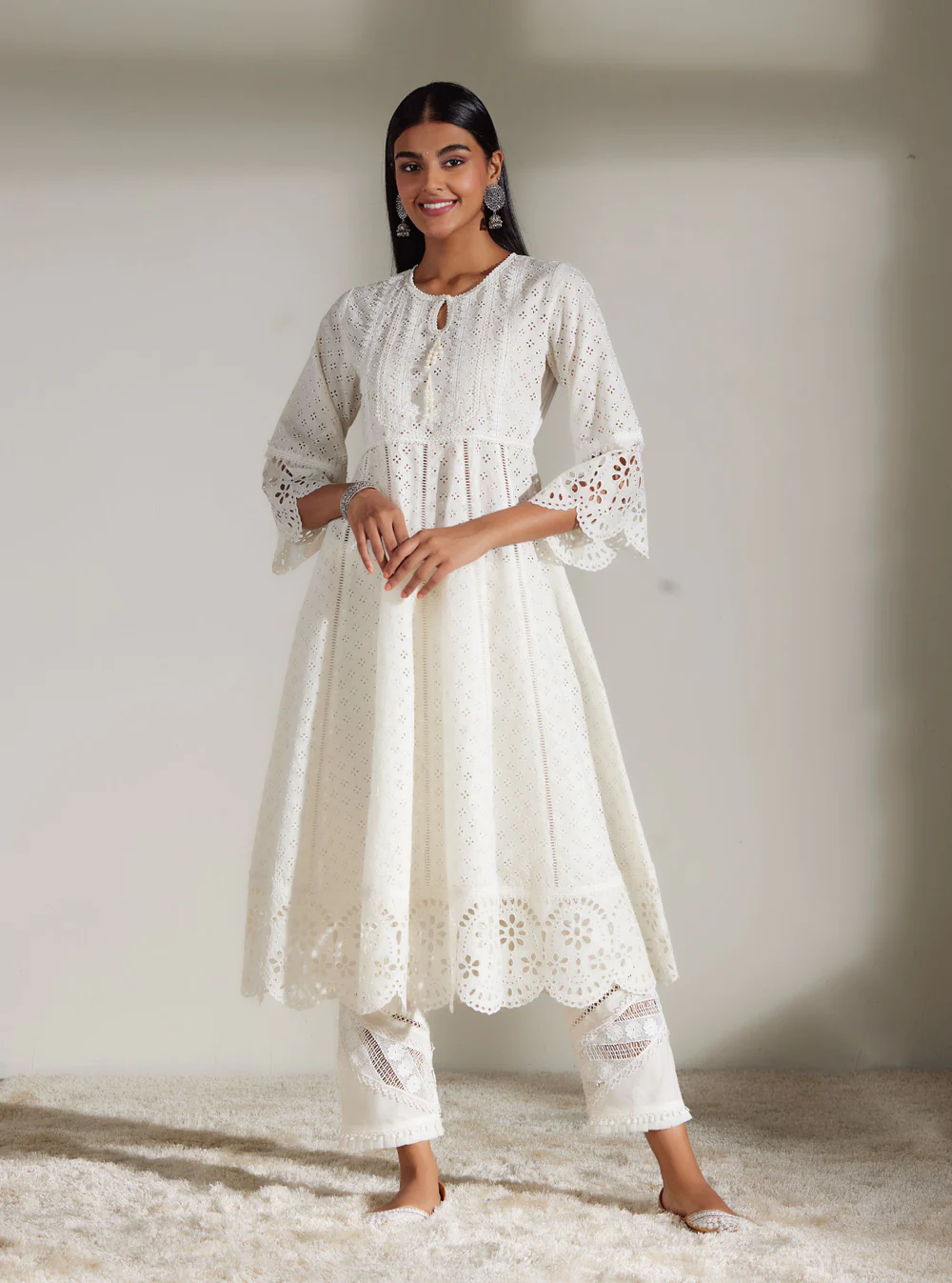 Making you stand out on every occasion be it during the daylight or sundowners, the arris set in the classic Anarkali silhouette is a soiree of multiple cutwork patterns enhanced by the floral lace trims at the waist, the fit and flare sleeves and the key-hole neckline.