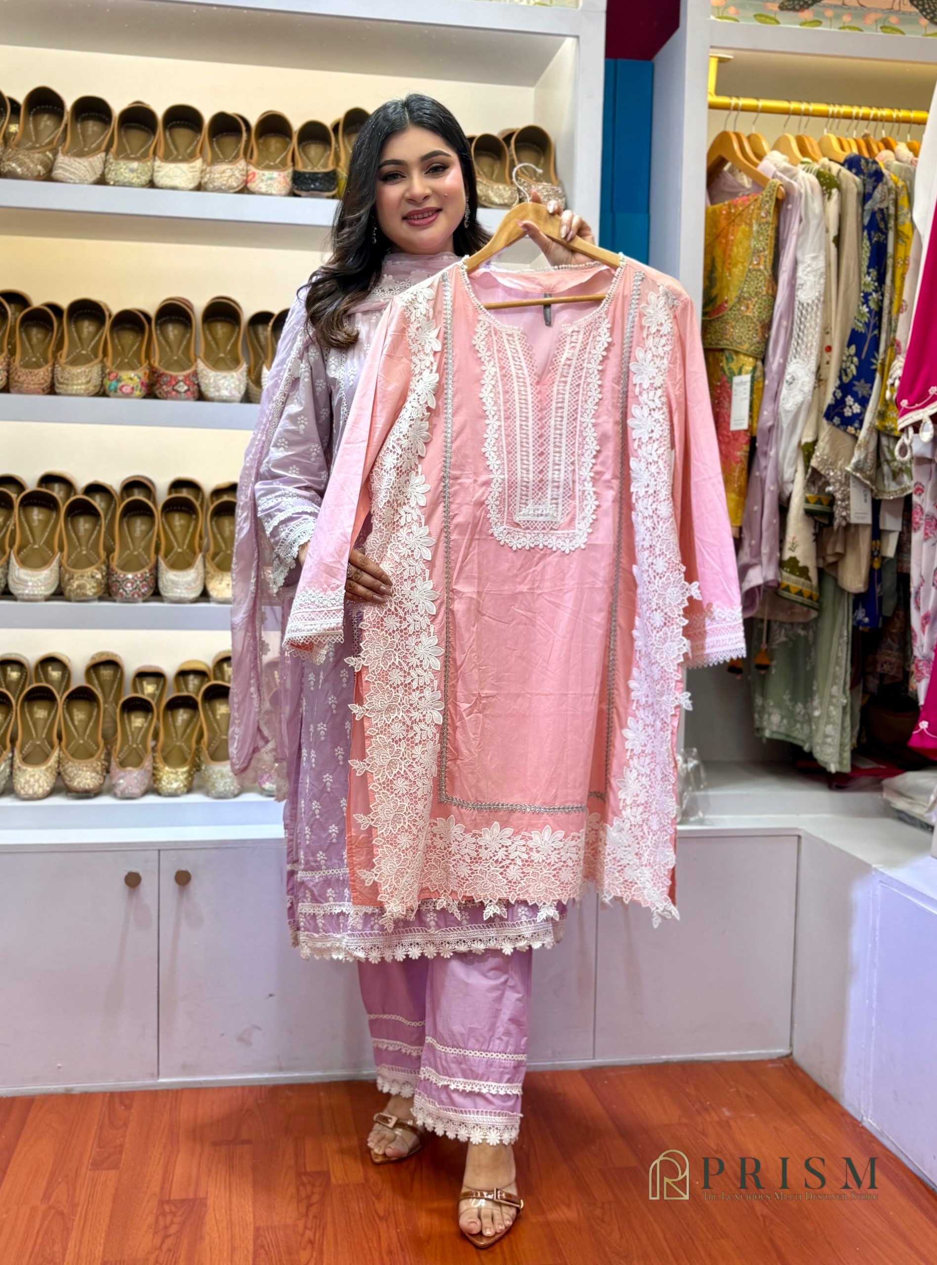 Mulmul Cotton Salisbury Pink Kurta With Scallop Lace White Pant