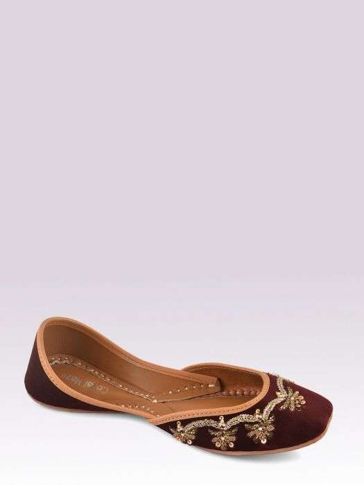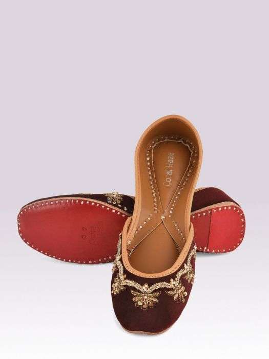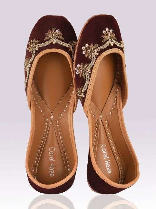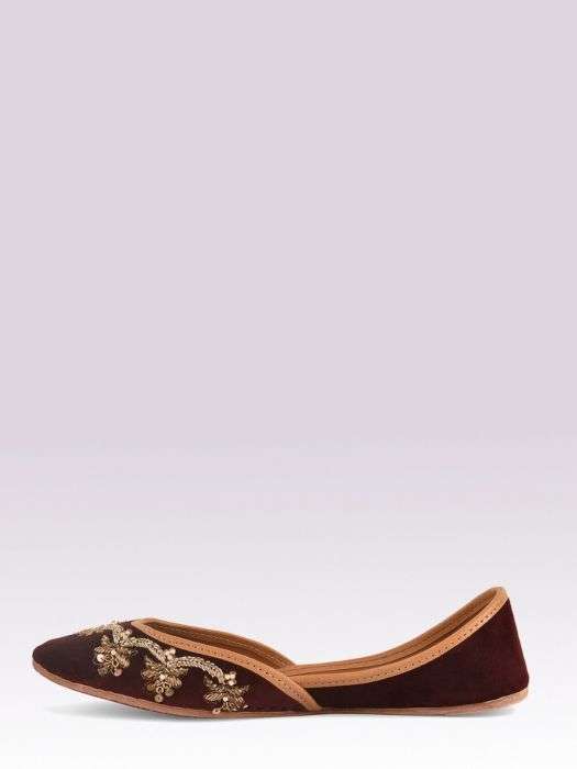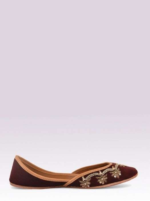 Wine velvet jutti with hand embroidered zardozi work