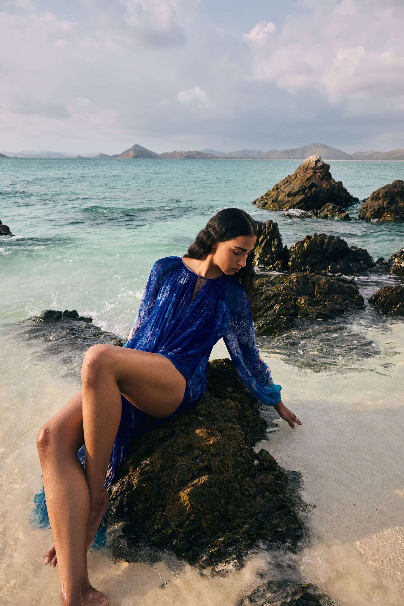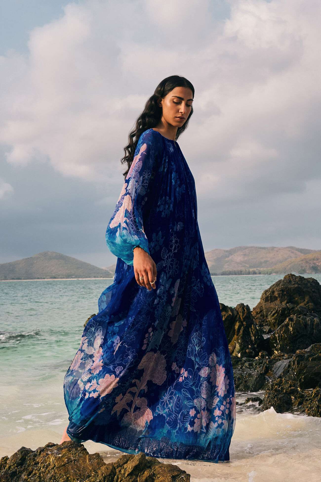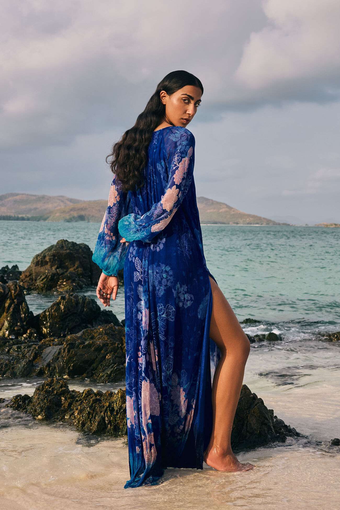 Designed in an electric blue hue, this BembergTM Chiffon kaftan is inspired by the enchanting waters of the ocean. It strikes a statement with contrasting floral prints all over and a statement thigh-high slit.