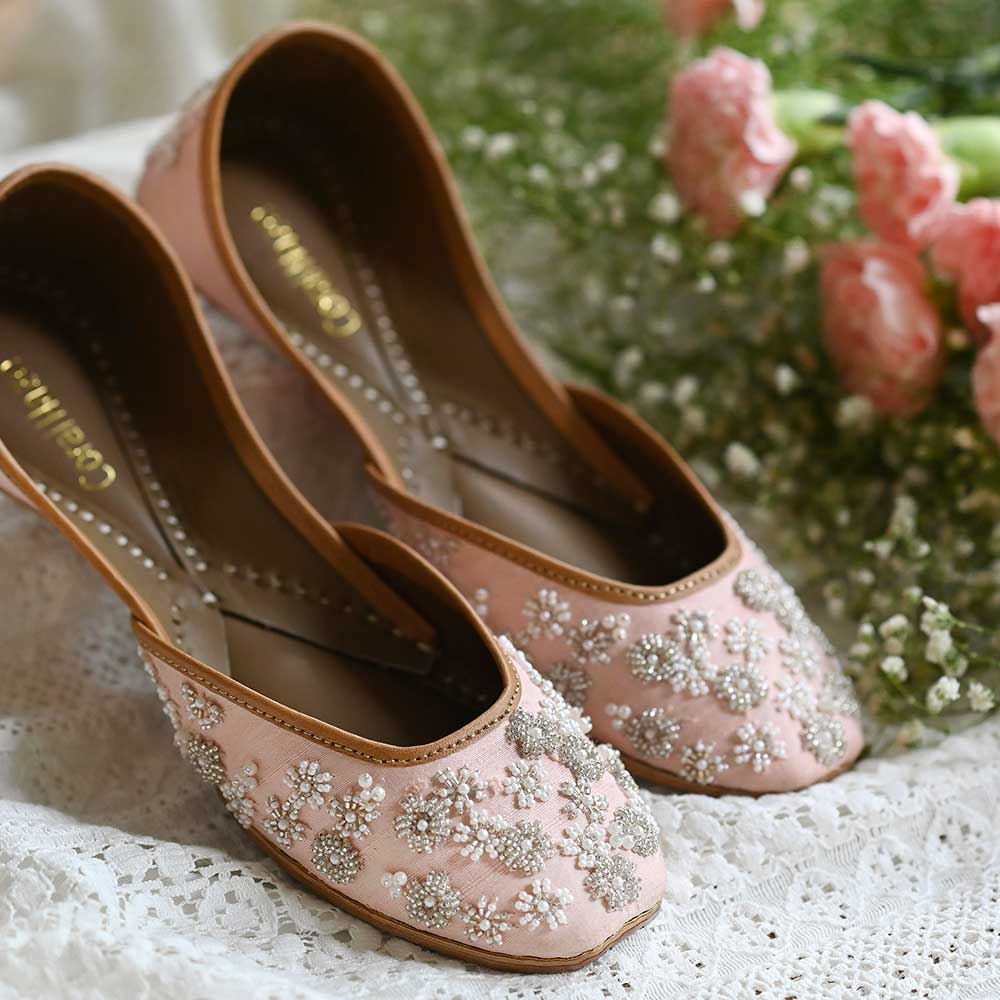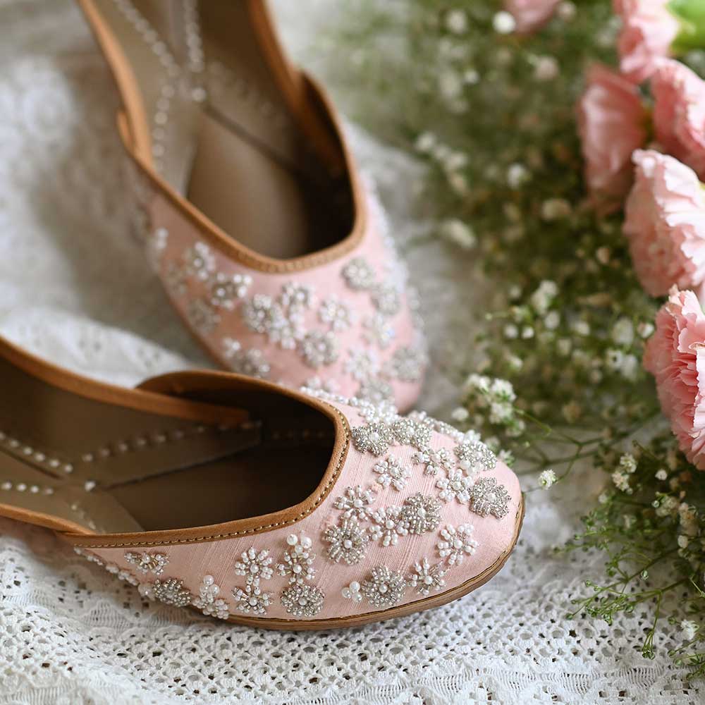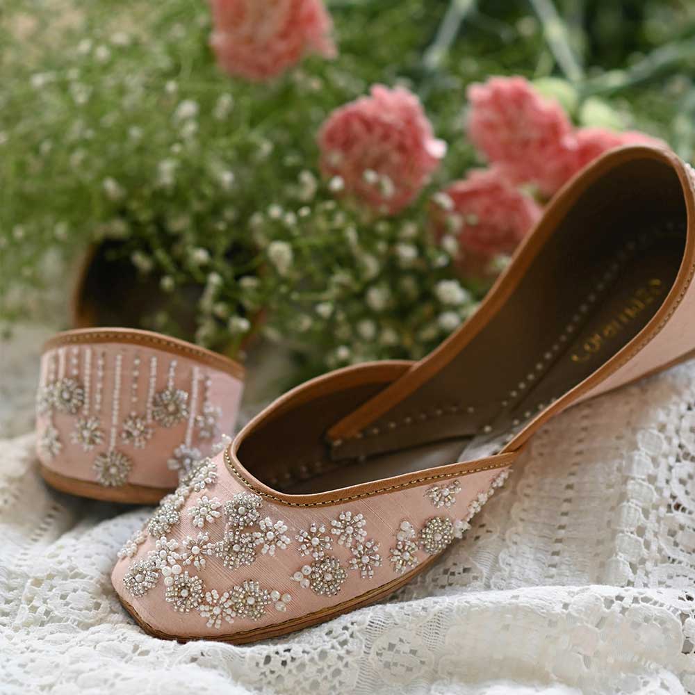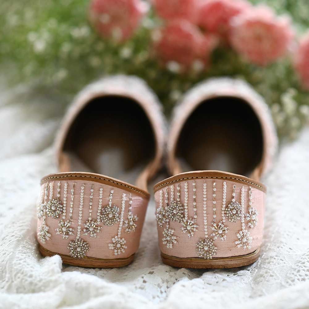 Raw silk juttis in the prettiest peach color, featuring an all-over, floral design on the upper and back. Hand embroidered using silver and gold glass beads and faux pearls in various shapes and sizes. The design is a mish-mash of assorted clusters of flowers and linear embroidery.