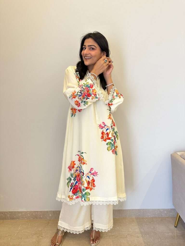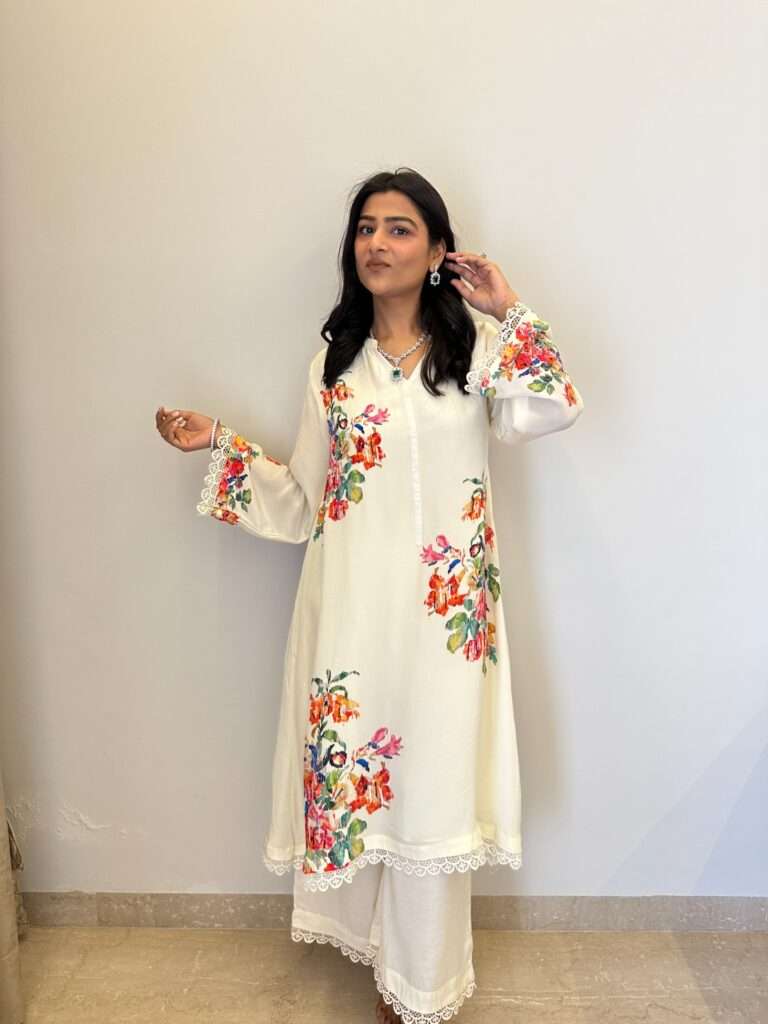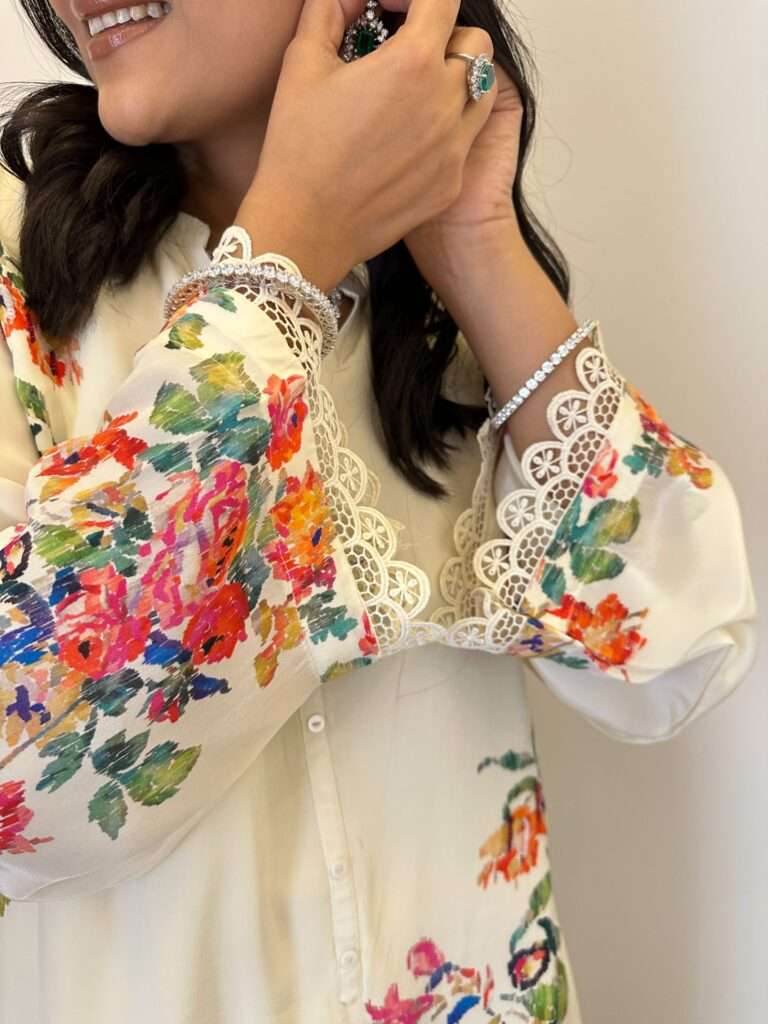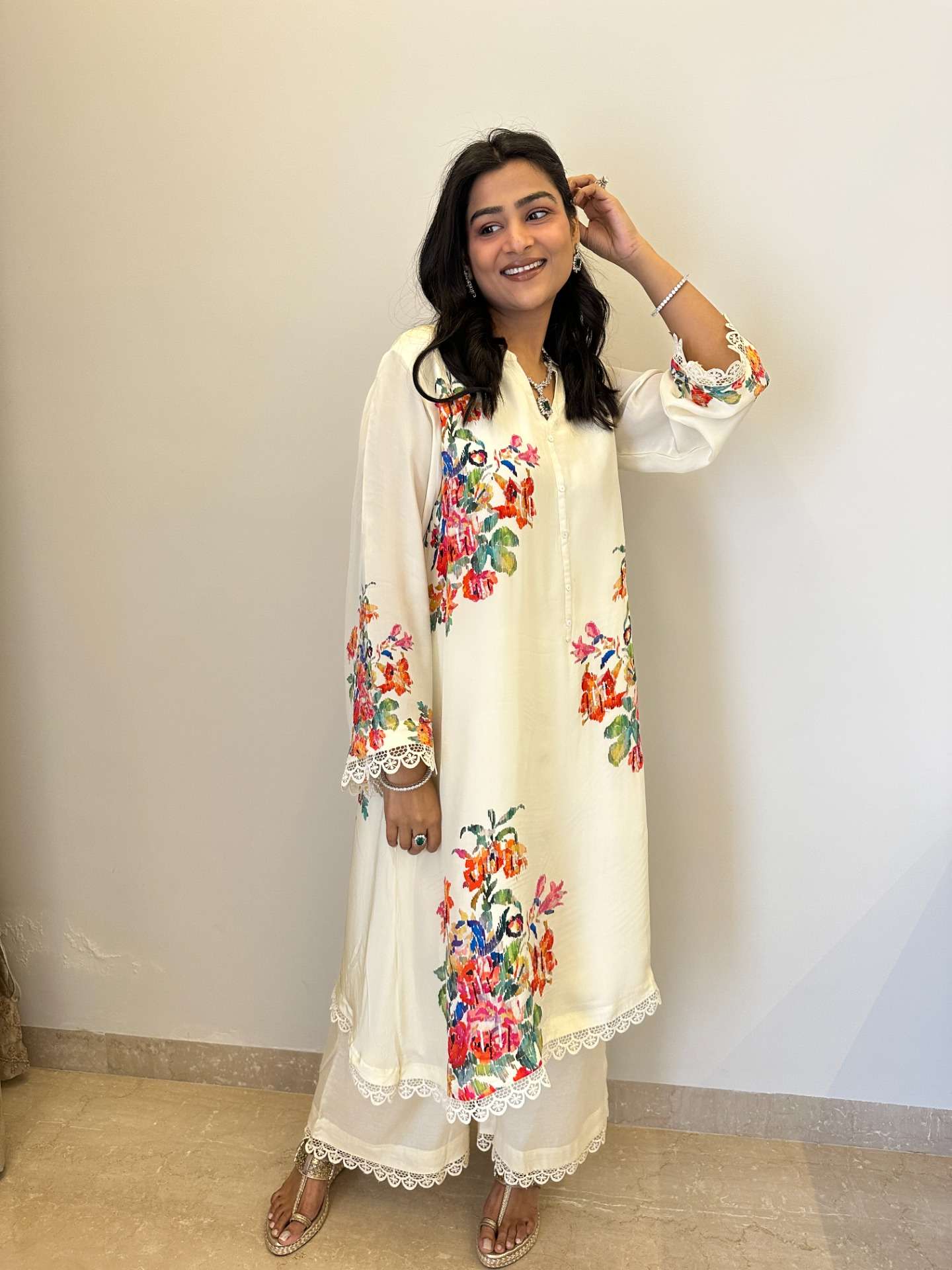 Details: Pure crepe cord set with digital print and sequence work on the top with lace detailing on the Bottom and Top.