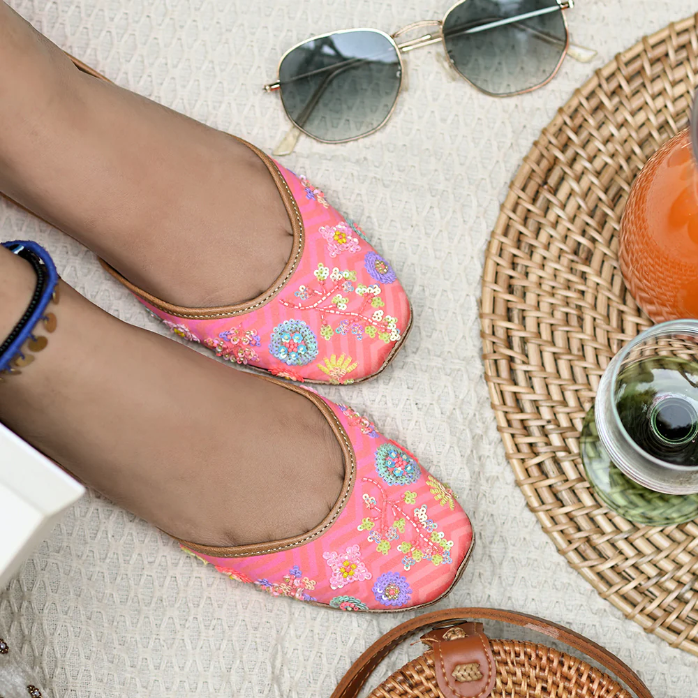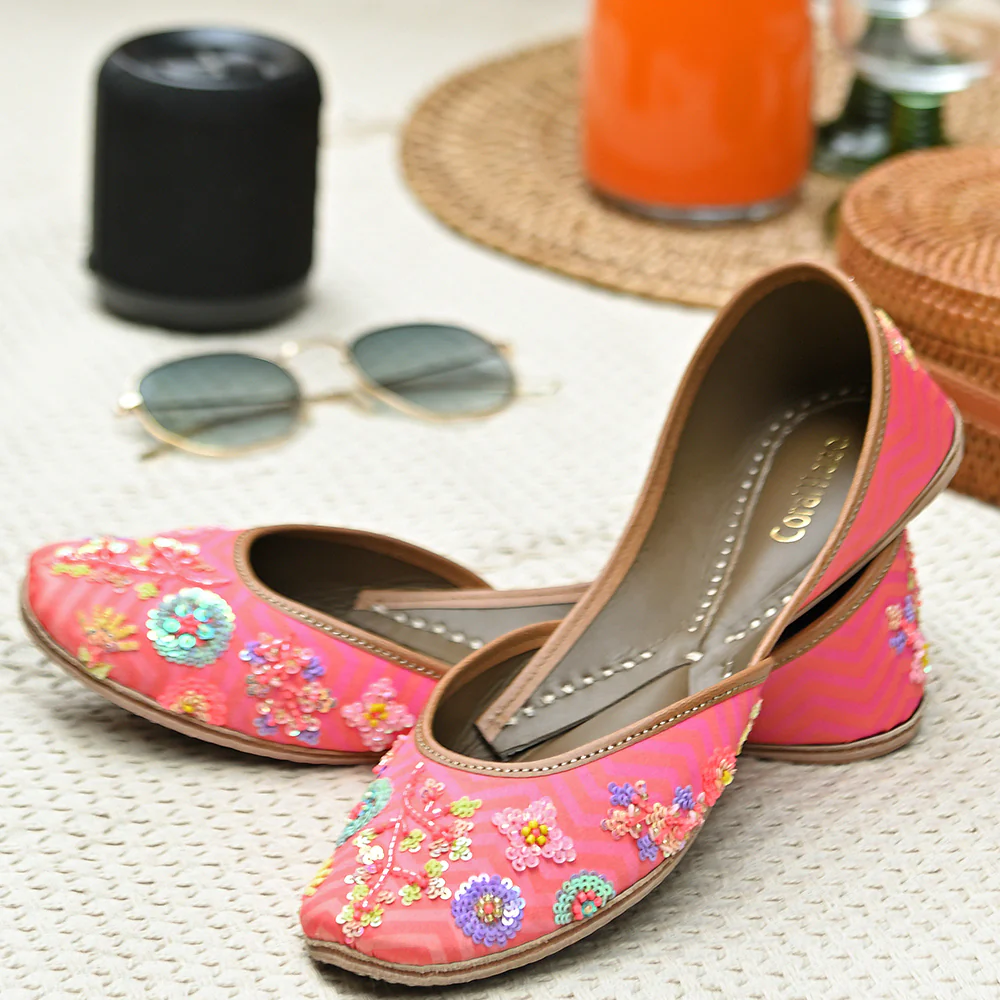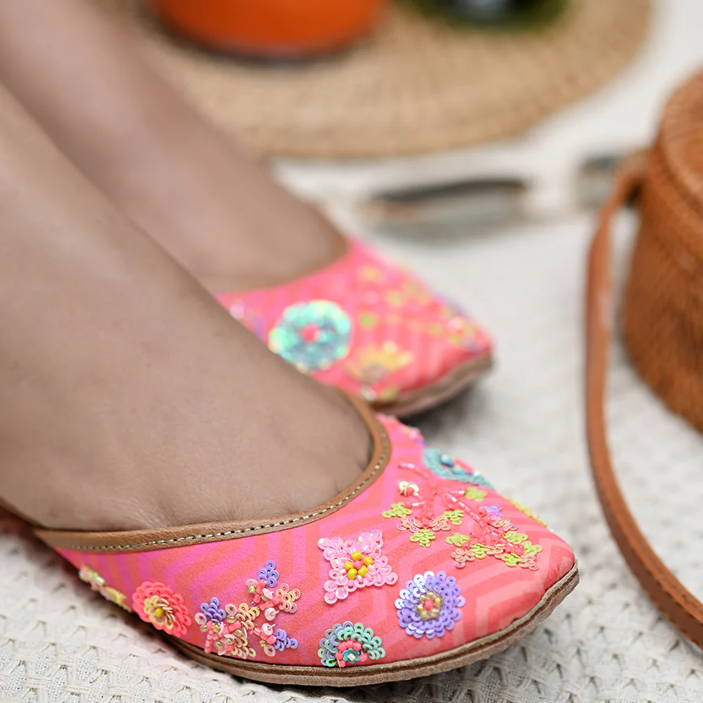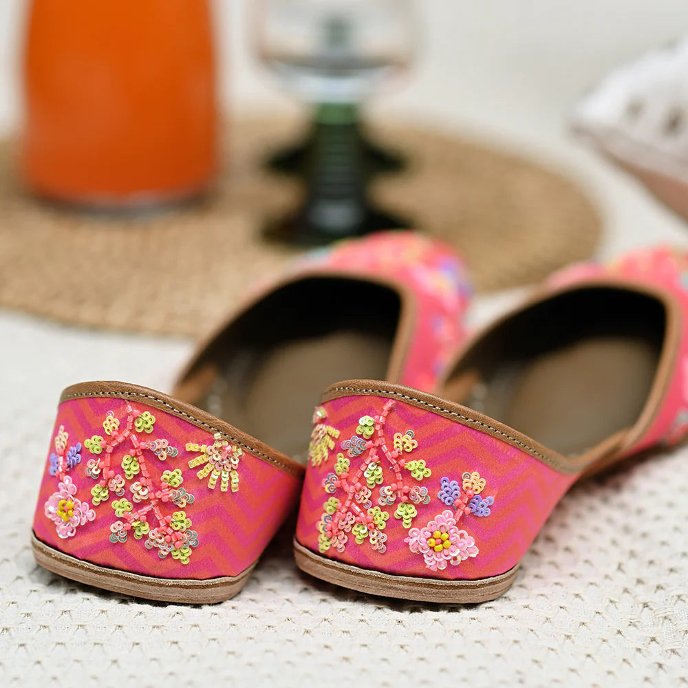 A bright and summery pair of mojaris, set on a pink and orange coloured chevron print silk base. The already fun base is accentuated with multi-coloured floral motifs, all hand-embroidered using sequins of various shapes and sizes alongwith glass and bugle beads. The design is kept very abstract and covers both the upper and the back of the mojaris.